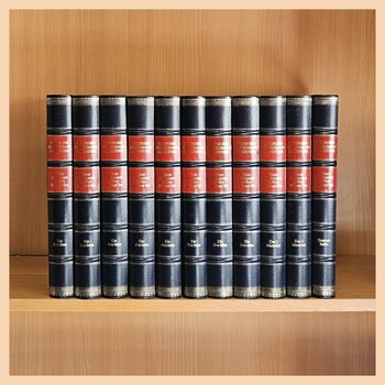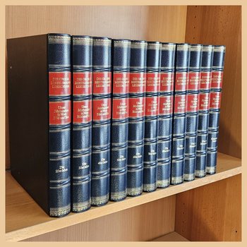 Eine dunkelblaue, elfbändige Lexikonreihe "Unser Jahrhundert in Wort und Schrift" über die Jahre 1920 bis 2019 mit Generalindex von Bertelsmann aus den Jahren 1994 bis 96.